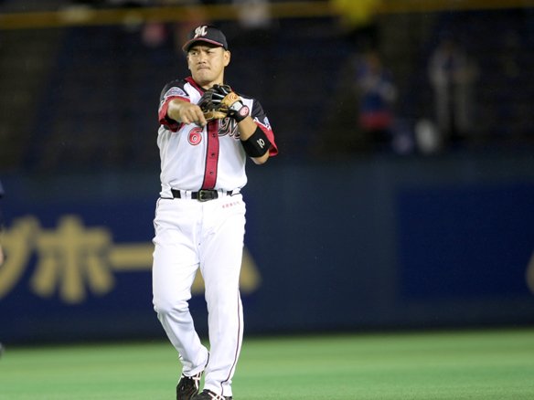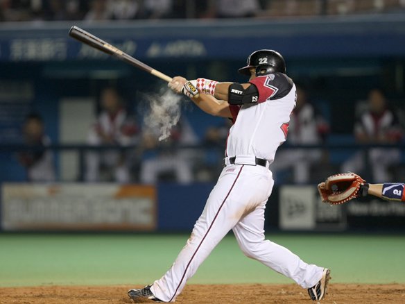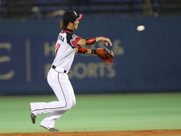 3番 中島 左翼二 2-2からアウトコースのスライダーを引っ張られ、鋭い打球となってレフト線を破りフェンスに到達した。レフト・角中がクッションボールを素早く処理して2塁にワンバウンドでストライク送球。クロスプレーとなるが判定はセーフ・・・。 |