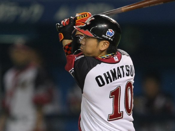 4番 大松 右中二 0-1からアウトコースのストレートを引っ張った打球は、セカンド・片岡の頭上を越えて右中間に転がった! 転々とする打球にセンター・栗山が追いつく間に、大松は一気に2塁を陥れた! |