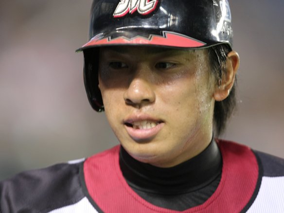 1番 西岡 右飛 1-2から真ん中高めのチェンジアップを引っ張ったが、打球はライト・G.G.佐藤にゆっくりと前進しながら捕球されてしまった。3塁ランナー・角中はタッチアップの構えを見せるが、G.G.佐藤のホームへの返球を見て自重した・・・。 |
