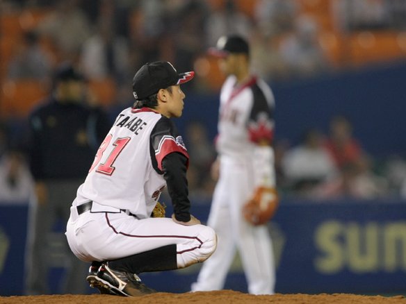 投手 渡辺俊 投手 渡辺 5番 石井 三邪飛 フルカウントから真ん中低めのカーブで打ち上げさせ、打球は3塁コーチャーズボックス付近でサード・今江が落ち着いて捕球した。 |