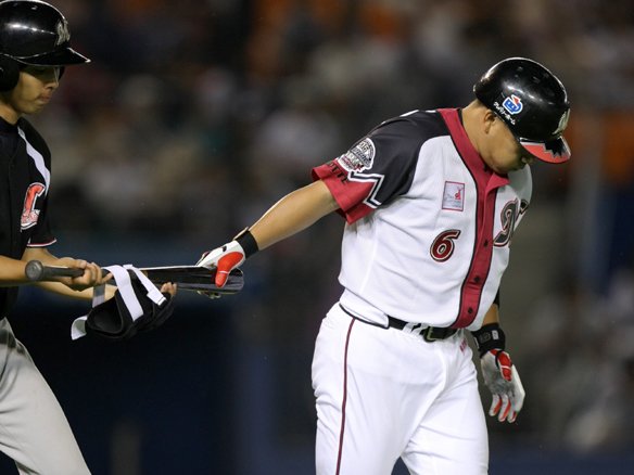 6番 G.G.佐藤 四球 1-3からカーブが低く外れてしまった。 |