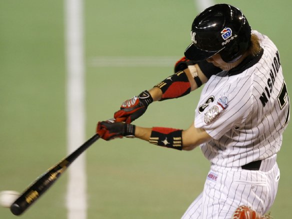 投手 西口 1番 西岡 左安 2-1からの4球目、アウトコースのストレートをきれいな流し打ち! ライナー性の打球がレフト・佐藤の前へと抜けていった! |