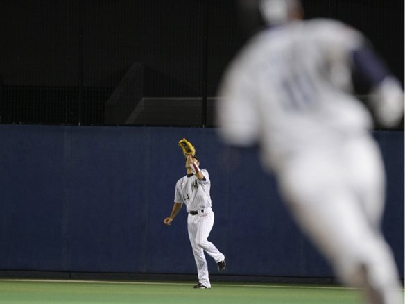 8番 今江 右飛 0-1からアウトコースの変化球を逆らわないバッティングでライト方向へ! 鋭い打球だったが、ライト・G.G.佐藤の定位置に飛んでしまった。G.G.佐藤が捕球すると同時に、2塁ランナー・橋本将はスタートを切り、3塁へ。 |