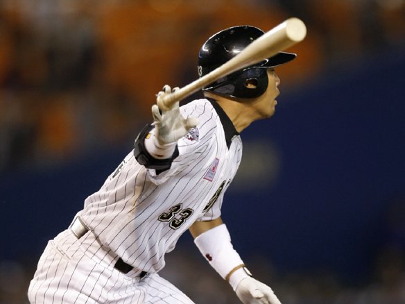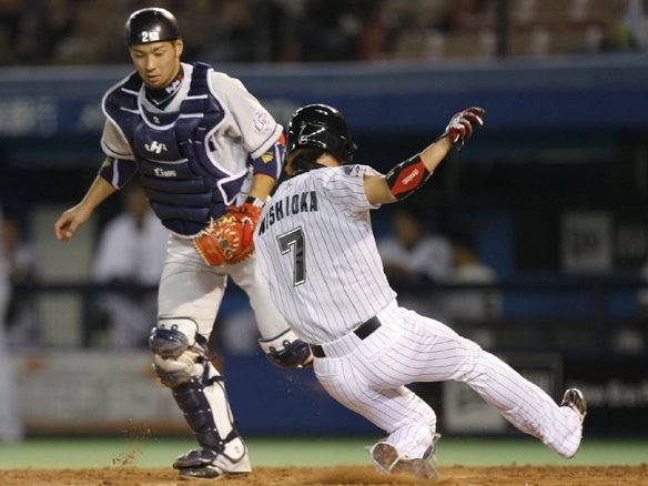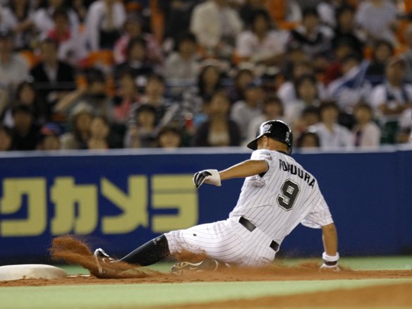5番 里崎 一安 2-2からの6球目、アウトコースのストレートをそのまま打ち返した! 打球はダイビングキャッチを試みたファースト・後藤のグラブに当たって転々とし、その間に打った里崎は1塁を駆け抜けた! 2塁ランナー・福浦は3塁ストップ。 |