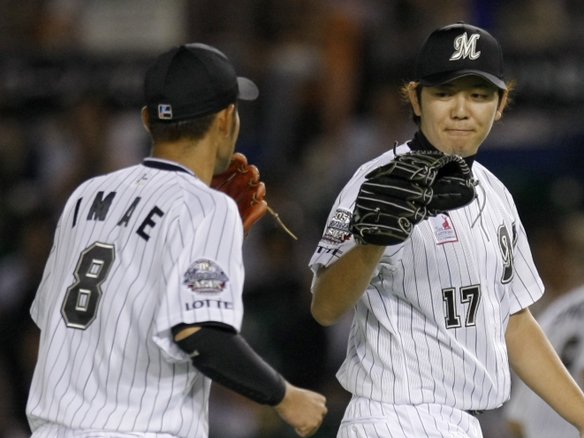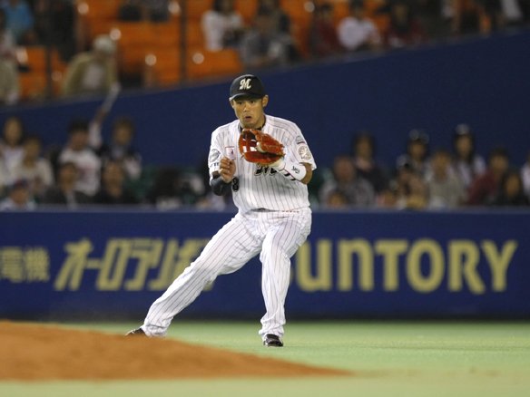 2番 栗山 三ゴ 2-1からの4球目、アウトコースのストレートを流し打ちされるが、サード・今江がダイビングキャッチでおさえた! 今江はすぐさま立ち上がり、1塁へワンバウンド送球! ファースト・福浦もこれをすくい上げ、アウト! ファインプレー! |