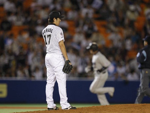 2-0からの3球目、カーブがワンバウンドしてホーム手前で大きく弾み、キャッチャー・銀仁朗の体に当たって、ボールはバックネットの前まで転がった! 1塁ランナー・福浦はこれを見逃さず、一気に3塁を陥れた! 記録は松永のワイルドピッチ。 |