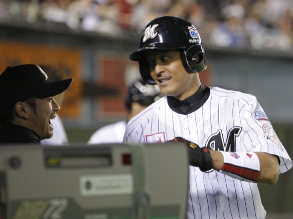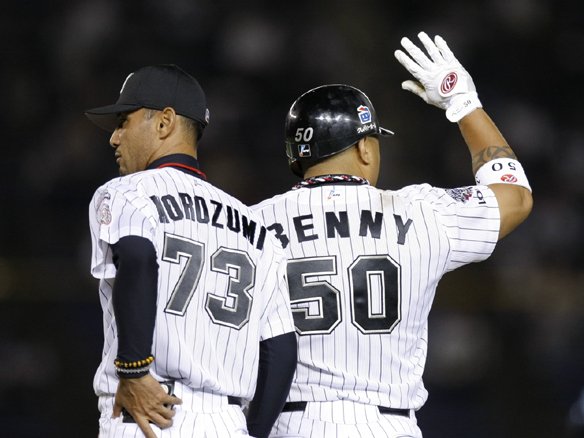 【千葉ロッテ選手交代】 2塁ランナー・里崎→代走・角中 1塁ランナー・ベニー→代走・南 |