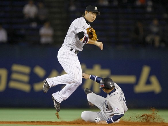 ベースカバーに入った塀内、6-4-3のダブルプレーを見せる