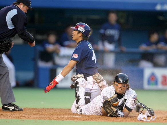 9番 山崎 左安 1-2から、アウトコース低めの変化球を体勢を崩しながらも三遊間へ運ばれた。飛びつくショート・西岡の横をしぶとく破り、前進守備のレフト・角中の前へ。2塁ランナー・小瀬は3塁を蹴って一気にホームへ。角中はホームへワンバウンド送球。クロスプレーとなるが、里崎の懸命なブロックで判定はアウト! ナイスプレー!!! |
