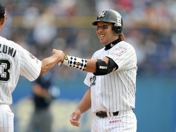 里崎がセンター前ヒットを放ち、笑顔でハイタッチを交わす