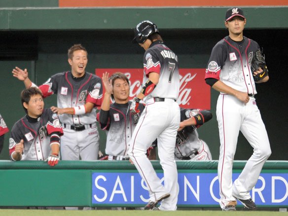 福浦の適時打で生還しナインの出迎えを受ける西岡