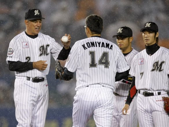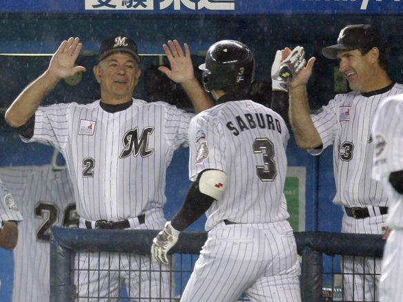 1-1から3塁ランナー・リンデンがスタート。中谷はスクイズの構えをするが、スクイズを読んだマリーンズバッテリーがウエストし三本間で挟んだ。ホーム手前でカバーに入ったファースト・福浦がリンデンにタッチするが、リンデンがミットに肘をぶつけ、福浦のミットからボールがこぼれた・・・。 判定はリンデンの守備妨害となりアウト。ボールが転々とする間に3塁に進んだ1塁ランナー・聖澤は、2塁に戻って試合再開。 |