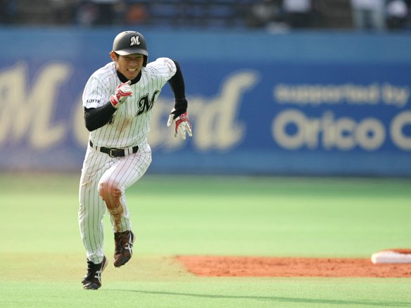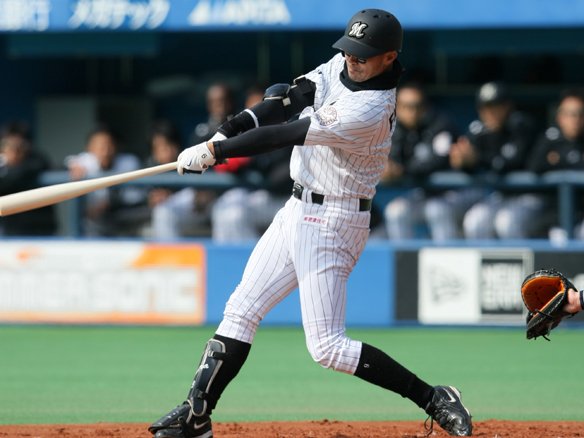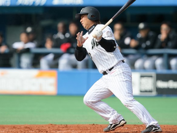 2番 荻野貴 中安 2-1からインコース寄りのストレートに詰まらされたが、打球は二遊間をしぶとく破った! 荻野貴、これが千葉マリン「初ヒット」! |