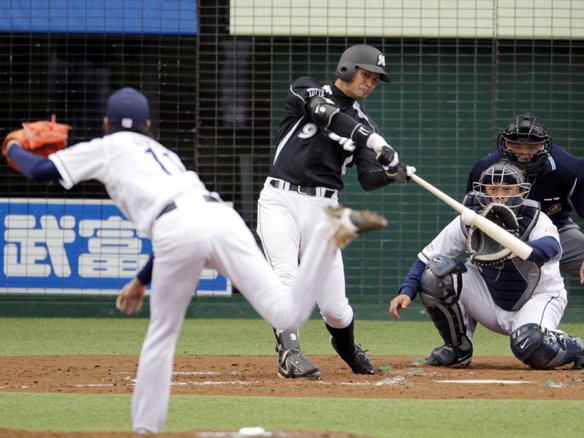 投手 野上 4番 金泰均 右安 0-1からアウトコース高めのストレートを逆らわずに弾き返した打球は、ライト・佐藤の前で弾み、来日初ヒットになった!! |