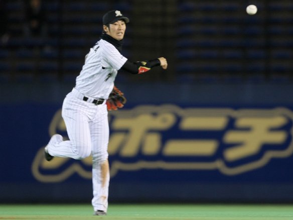 2番 渡辺直 遊ゴ 初球、アウトコースのストレートを弾き返されて球足の速いゴロとなった打球は、センターに抜ける寸前にショート・西岡が体の横にグラブをのばして拾い上げ、軽快なステップで1塁に送球して打ち取った!! |