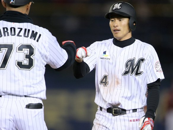 開幕から7試合連続ヒットとなった西岡が火をつけると、機動力を見せて金泰均の犠牲フライで1点の先制に成功! 唐川を強力に援護しました!! |