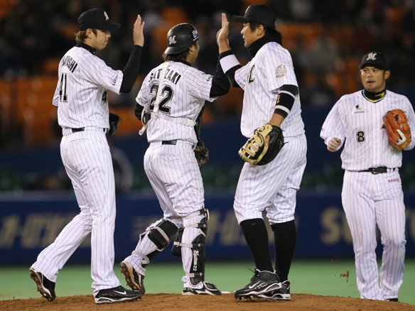 8番 里崎 中飛失 2-0からの3球目、真ん中低めのチェンジアップを高く打ち上げてしまった打球は、前進してきたセンター・牧田が体の前でワンハンドキャッチをしようとしたが、球がグラブからこぼれた。2塁ランナー・南がホームイン。6対0。打った里崎は1塁でストップ。記録はセンター・牧田のエラー。 |