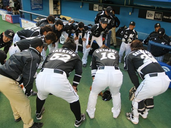 試合前に円陣を組み気合を入れるマリーンズナイン