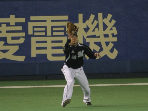 7番 福浦 中犠飛 2-1からファールで2球粘った後の6球目、アウトコース真ん中の変化球をすくい上げた打球は強風に戻され高々と舞い上がり、センター・鉄平に捕球された。3塁ランナー・大松がタッチアップで還り2対2の同点! ![]() 2