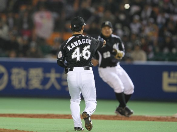 投手 川越 1番 渡辺直 二ゴ 1-1から真ん中高めのカットボールを打たせた打球は、平凡なゴロとなりセカンド・井口が正面で捕球し1塁へ送球。 |