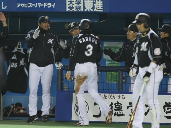 6番 サブロー 右安 2-0からアウトコース真ん中のストレートを弾き返し、鋭い当たりとなった打球は横っ飛びしたセカンド・高須の横を破りライト前へ! 2塁ランナー・井口が還り1対2! サブローの5試合連続ヒットとなるタイムリーで点差を縮めた! 1塁ランナー・大松は3塁へ! ![]() 1