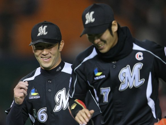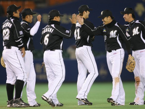 勝利し笑顔でタッチを交わすマリーンズナイン
