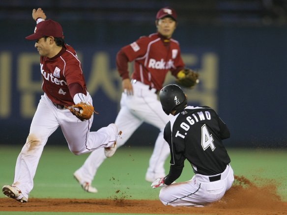 1番 渡辺直 三ゴ 0-1からインコースのストレートを引っ掛けさせ、ボテボテのゴロとなった打球はサード・今江が捕球して一度グラブから弾くが、素早く拾って1塁に送球した。2塁ランナー・聖澤は3塁へ、1塁ランナー・内村は2塁に進塁。 |