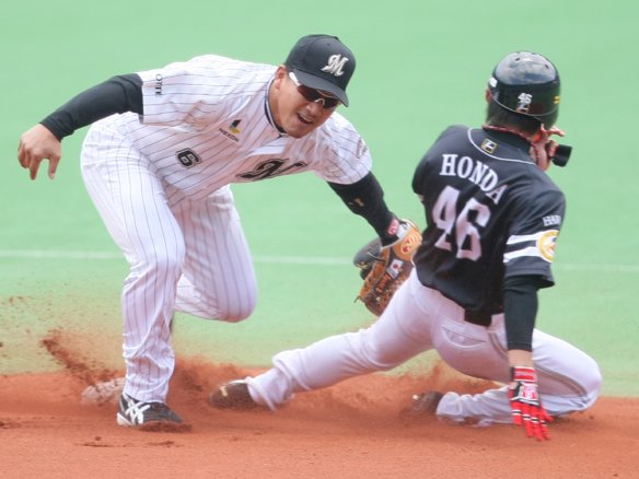 0-1から1塁ランナー・本多がスタート。キャッチャー・里崎は素早いステップで2塁に矢のような送球を見せ本多を刺した! 盗塁失敗。 |