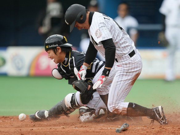 初球、1塁ランナー・荻野貴がスタート。キャッチャー・山崎の送球は大きく逸れセンター前に抜けていった。その間に荻野貴は3塁を陥れた! 記録は盗塁と山崎のエラー。 |