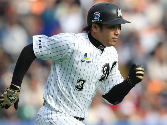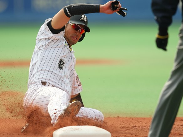 3番 井口 遊選 1-0から真ん中低めのシンカーを引っ掛けた打球は、ボテボテのゴロとなり前進したショート・川崎が捕球。3塁ランナー・荻野貴は果敢に本塁を狙う。川崎からの送球はワンバウンドとなり、キャッチャー・山崎は前に落としてしまった。滑り込んだ荻野貴がホームイン! 1対0! 荻野貴が自慢の快足で1点をもぎ取った! ![]() 1