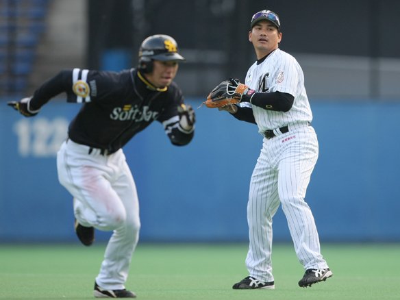 5番 大松 一ゴ 初球、アウトコース真ん中のカーブを引っ張った打球は、低いゴロとなりファースト・小久保が捕球し2塁ベースカバーに入ったショート・川崎に送球。1塁ランナー・金泰均がフォースアウト。川崎は1塁に転送するが判定はセーフ。その間に2塁ランナー・井口は3塁へ進んだ。 |