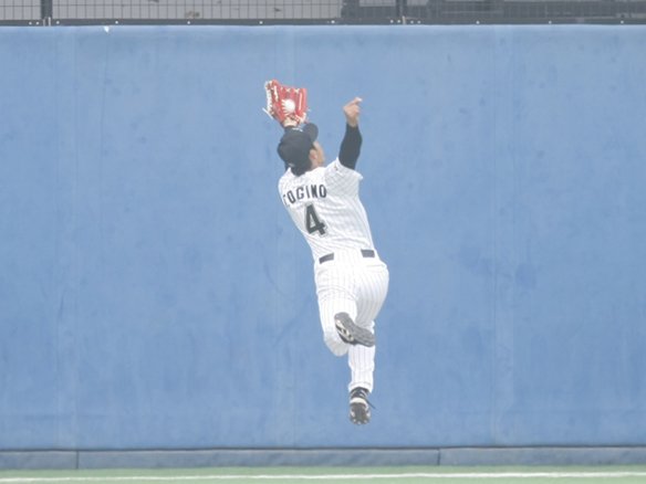 投手 渡辺俊 投手 渡辺 3番 糸井 中飛 1-2からアウトコース高めのシンカーを弾き返された大きな打球はセンター・荻野貴の頭上を襲ったが、半身の体勢で追いかける荻野貴が最後はフェンスの方向を向きながら飛び上がり、グラブの先でキャッチ!! スーパープレーでスタンドが沸き上がる!! |