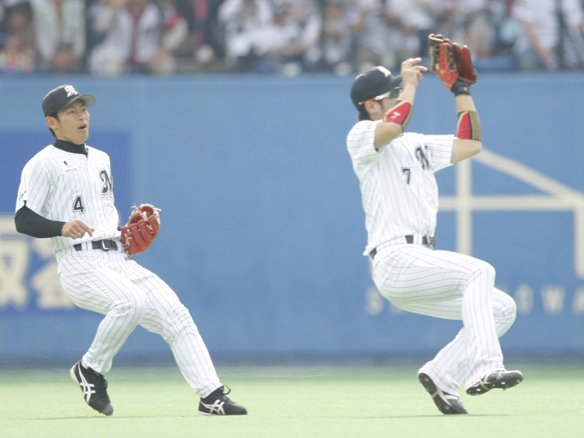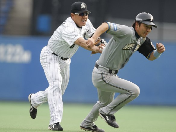 投手 渡辺俊 2番 森本 0-1からバントの構えを見せられ、アウトコース高めのカーブを当てられた打球は1塁側への小さなフライになった。キャッチャー・里崎と森本が交錯する中、球を拾い上げた里崎が森本にタッチ。しかし、送りバントを決められて2塁ランナー・田中賢は3塁へ・・・。 |