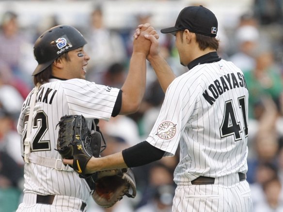 3者連続三振を奪った小林宏は里崎とハイタッチ