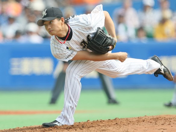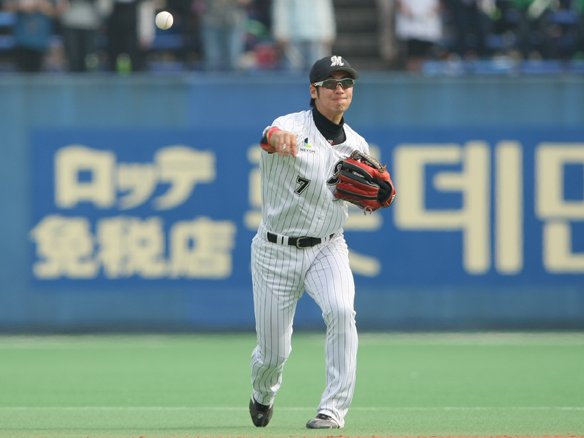 8番 里崎 遊ゴ 0-1からバスターでボール気味、真ん中高めのストレートを引っ張った打球は、ボテボテのゴロとなりショート・金子誠が捕球し1塁へ送球。投球と同時にスタートした1塁ランナー・南は2塁に進塁。バスターエンドランでランナーを進めた。 |