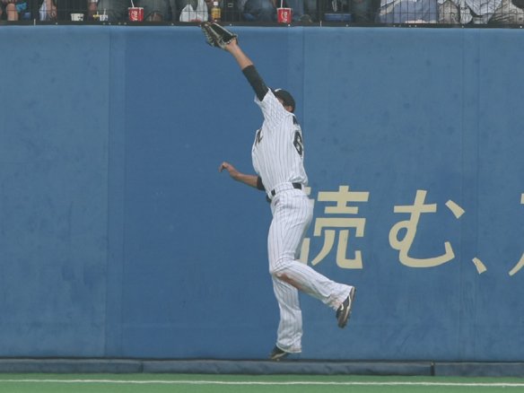 1番 田中賢 右飛 1-3からインコース低めのストレートを引っ張られ、打球は右中間に飛んだがフェンス際でライト・南がジャンピングキャッチした! |