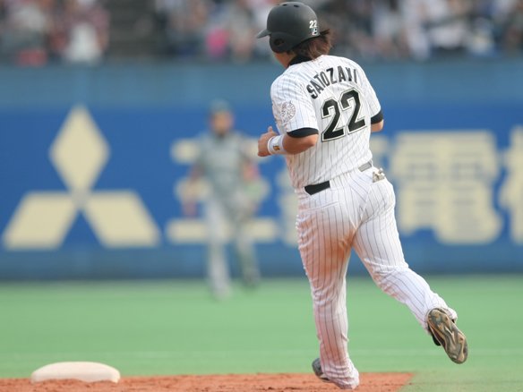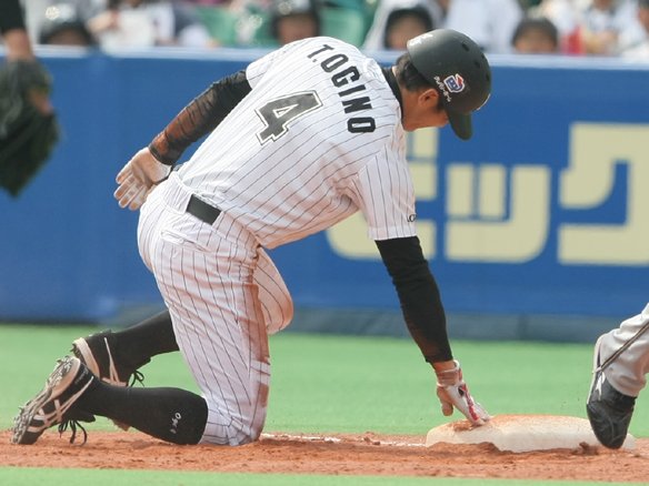 里崎は暴投の間にすかさず2塁を陥れる!