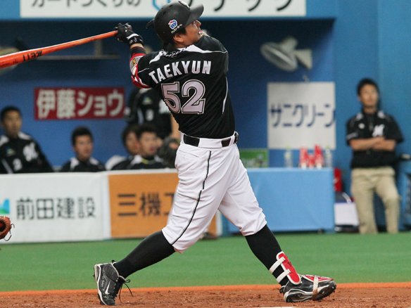 4番 金泰均 左中本 初球、高めに甘く入ったスライダーを振り抜き、打った瞬間それと分かる打球がセンター方向へ! 打球はセンターバックスクリーン横で跳ねる第9号3ランとなり6対1! ![]() 1
