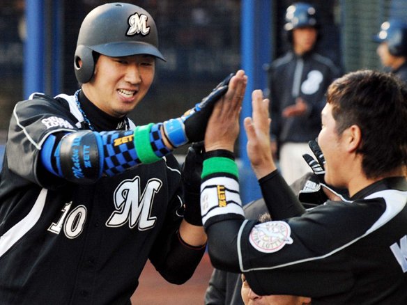 9番 清水 中安 1-2から真ん中高めのストレートをたたきつけられた打球は、追いかけるセカンド・井口の横を抜け、センター・荻野貴の前に転がっていった。 |