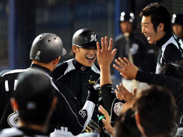 今日ホームランを放った大松、サブローが三振に倒れると、里崎も鋭い打球を弾き返しましたが、ベイスターズの2番手・牛田の前に3者凡退に終わってしまいました。さぁ、あとは9回裏を残すのみ。ベイスターズの反撃を断ち切って、勝利を手にしましょう!! |