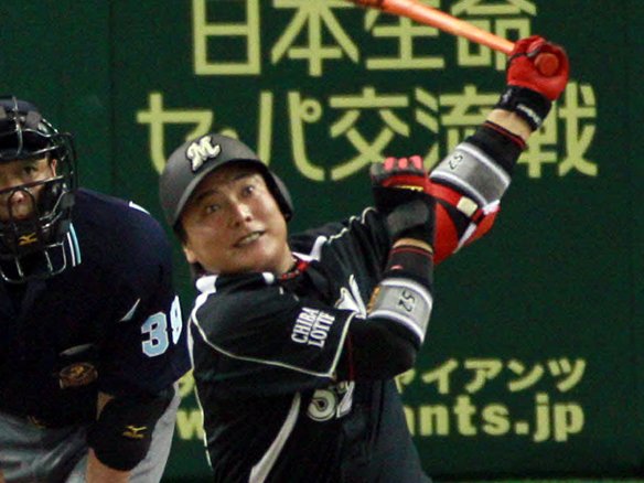 7番 李スンヨプ 空三振 2-1から真ん中低めに落ちるチェンジアップでタイミングを外した! ボールを前にこぼしたキャッチャー・里崎はすばやく拾って1塁に送球した。 |