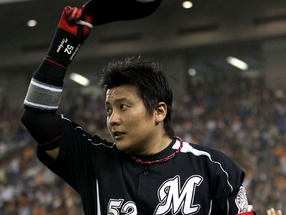 7番 李スンヨプ 中飛 2-2から真ん中高めのストレートを強振されたが、打球は高々と上がり落下点に入ったセンター・荻野貴が落ち着いて捕球した。 |