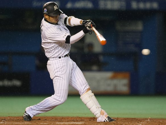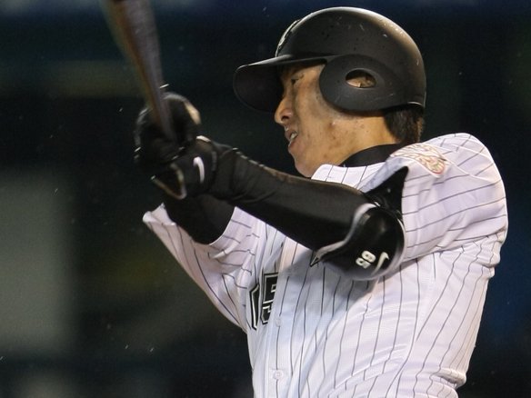 投手 吉見 3番 井口 左翼安 初球、インコースのシュートを振り抜いた打球は3塁線を襲い、3塁ベースに当たってレフトへ抜けていった!! |