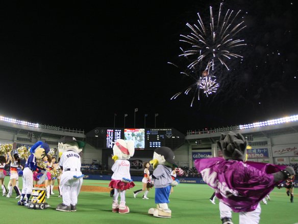 両チームのマスコットが夜空に花火を描く