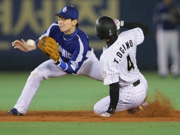 4番 金泰均 三ゴ失 初球、インコースのシュートを詰まらされた打球はサード・森野が捕球し1塁に送球するも低く外れ、ファースト・ブランコがおさえられず後逸。これを見て2塁ランナー・荻野貴は一気に生還し2対0! 打った金泰均は2塁へ! 記録は森野のエラー。 |