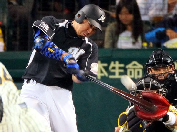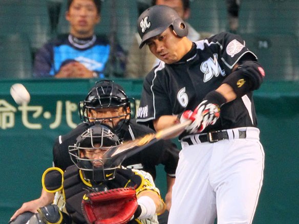 昨年は同じ甲子園で6回を投げて2点におさえこまれたタイガース・久保を相手にした好調のマリーンズ打線。今年は一味違います。先頭の西岡が18試合連続ヒットを放って出塁すると、試合開始からわずか7球で先制に成功しました!! |