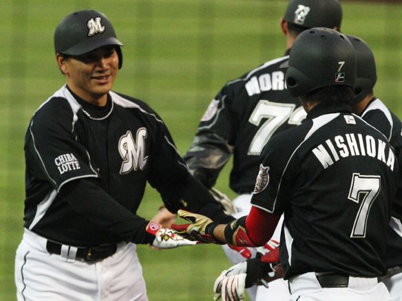 先制の3ランを放った井口は西岡とタッチ!