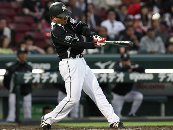 6番 サブロー 左翼二 0-2からアウトコースへのストレートを力強く引っ張ると、痛烈な打球が3塁線を襲った! ボールがフェンスへ到達する間に3塁ランナー・井口が生還して8対1! 1塁ランナー・大松は3塁へ進塁し、打ったサブローは2塁へ! ![]() 1