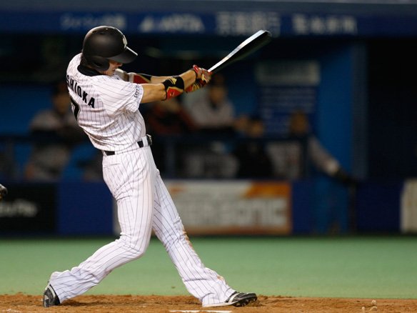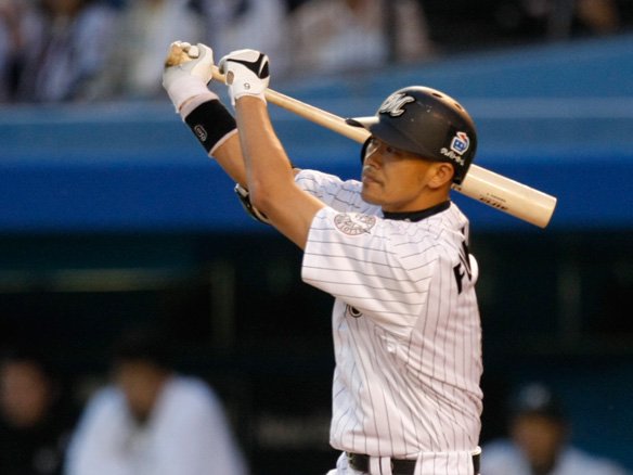 7番 高橋由 右安 1-0からアウトコース低めへのストレートを合わせるように弾き返すと、打球はセカンド・井口の頭上を越えてライト・サブローの前に落ちてしまった。 |