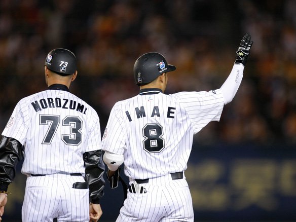 2番 今江 左安 1-0から低めに外れるチェンジアップをすくい上げるようにしぶとく打ちにいくと、打球はショート・坂本のグラブを弾いてレフトへと転がった! 3塁ランナー・里崎が生還して6対1。投球と同時にスタートしていた1塁ランナー・西岡は3塁へ! ![]() 6